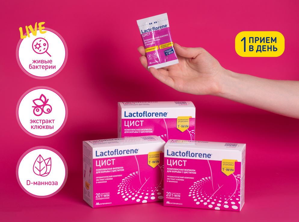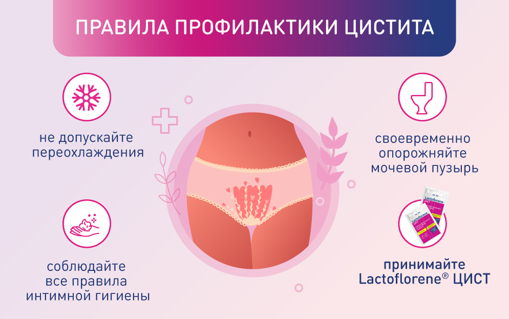 принимать Lactoflorene® Цист — пробиотический комплекс, способствующий уменьшению инфекционно-воспалительных процессов мочевыводящих путей.