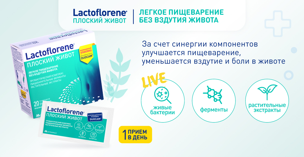 Усилить диету можно добавив фермент альфа- и бетта-галактозидазу. Пробиотический комплекс Lactoflorene® Плоский Живот — это продукт, который содержит сразу оба фермента. За счет синергии компонентов Lactoflorene® Плоский Живот (бифидо- и лактобактерии, ферменты пищеварения и растительные экстракты) улучшается пищеварение, уменьшается вздутие и соответственно, боли в животе.